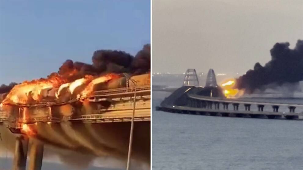 Efter en explosion på den viktiga väg- och järnvägsbron Kertjbron som förbinder Krim med Ryssland utbröt en brand. The Crimean Bridge Russian.